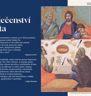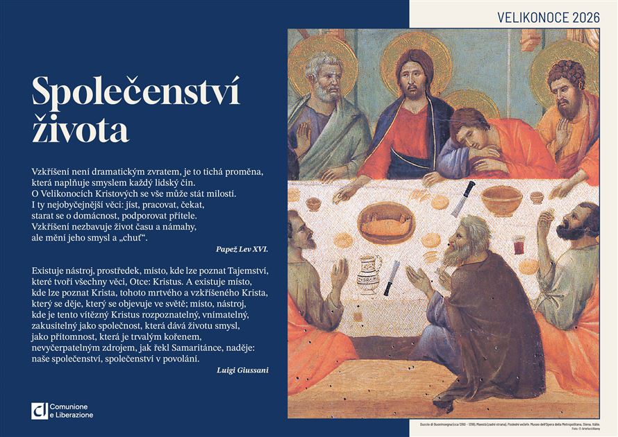 "Společenství života". Slova papeže Lva XIV. a dona Giussaniho doplněná detailem z obrazu Poslední večeře od Duccia di Buoninsegna, který je vystaven v Museo dell´Opera del Duomo v Sieně.Společenství života
